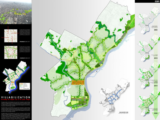 旅するヴォイド。100年かけてヴォイドがゆっくりと京都を横断する。100年の都市計画は難しい。そもそも都市計画の長期計画とはせいぜい20年、30年計画であって、100年後の未来を予測するのは不可能に近い。そこでわれわれは、都市を計画するのではなく、巨大な空白地帯であるヴォイドを旅させる(=破壊する)ことによってあらたな活力を生み出すことを提案した。新しいものをつくるのではなく破壊が生成を生む。われわれが計画するのは10年に一度、都市の方向性を決定するためのナビゲーターと呼ばれる都市建築物のみである。これは極端なことではない。そもそも京都の歴史がそうであった。活力を保つために、都市構造を大胆に再編し、地下のグランド・サーキットの進展にしたがって、旧市街地から自動車交通が減少していく。世界都市京都に向けたヴォイドの旅にしたがって、都市プログラムは再配置され、あらたな京都が100年かけて誕生する。